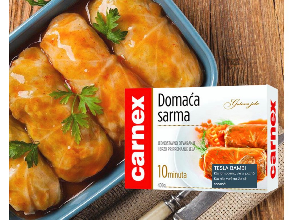 Zloženie: sarma 55% (kyslá kapusta, bravčové mäso 21%, voda, ryža, cibuľa, SÓJOVÝ proteín, soľ, slnečnicový olej, korenie a extrakty z korenia, cukor) omáčka (voda, paradajkový koncentrát, PŠENIČNÁ múka, slnečnicový olej, soľ, korenie a extrakty korenia (CELER), zvýrazňovač chuti E621).