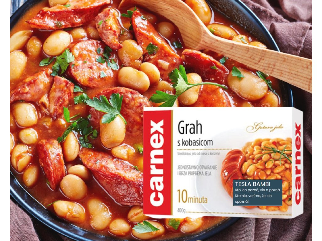 Zloženie: omáčka (voda, zelenina (cibuľa, paprika, mrkva), PŠENIČNÁ múka, slnečnicový olej, soľ, paradajkový koncentrát, korenie a koreninový extrakt (CELER). cukor), fazuľa 25 %, klobása 20 % (bravčové mäso 10 %, voda, spojivo tkanivo, tukové tkanivo, SÓJOVÁ bielkovina, PŠENIČNÁ múka, soľ, korenie a koreninové extrakty, regulátor kyslosti E262, stabilizátory (E450, E451, E452), cukor, krvná bielkovina, konzervant (E250)