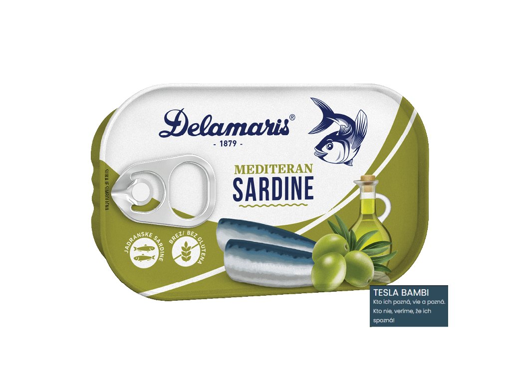 Modrá sardinka s latinským názvom "Sardina Pilchardus" sa používa v sardinkách. Svoje meno dostala podľa talianskeho ostrova Sardínia, kde sa kedysi hojne vyskytovali. Dnes žije v húfoch na Jadrane, v Stredozemnom mori a v Atlantiku. Produkty Delamaris využívajú doslova iba ich jadranské sardinky, ktoré vynikajú skvelou chuťou a kvalitou v porovnaní s ostatnými sardinkami. Niekoľkokrát boli ocenené i medailami.