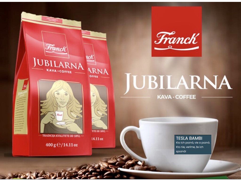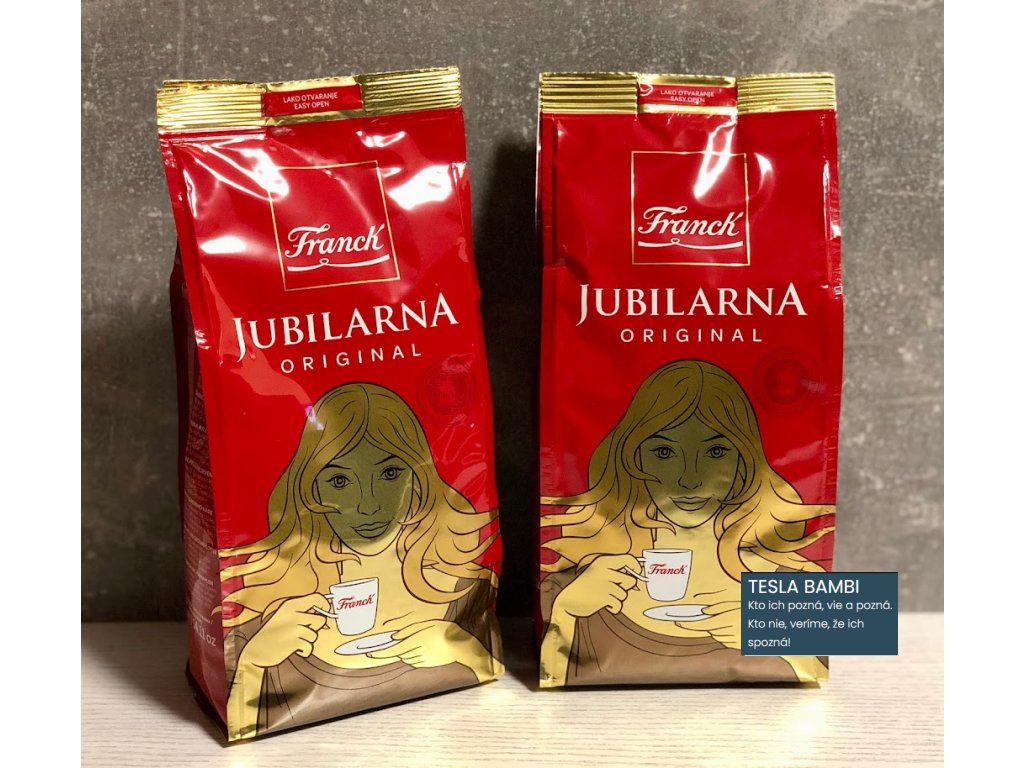 Pri káve sa prebúdzame, pracujeme, premýšľame, plačeme, smejeme sa, stretávame... Vie byť silná, sladká, zmyselná, slabá, horká, bežná, ale i výnimočná, bohatá,.. Presne tak ako život, taká je aj "Franck JUBILARNA káva". Okrem kávy samotnej je zmes Jubilar obohatená o bohatosť tónov čokolády a mandlí. Verte, že zaujímavé prepojenie a chuť, ktorá chce vás očariť, vzpružiť a naladiť. Už viac ako 50 rokov na trhu.