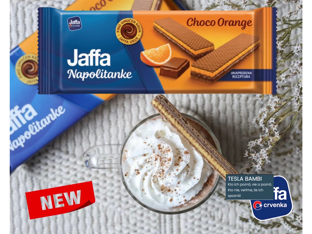Jaffa Napolitanke od dlhoročného srbského výrobcu chutných keksov a sušienok JAFFA crvenka. Veľmi zaujímavé a chutné prepojenie chuti, kakao, čoko a plnka s pomarančovým krémom.