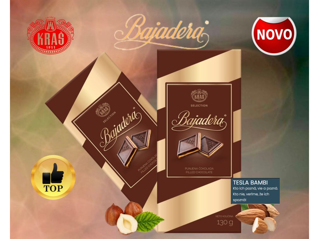 Keď sa povie na Jadrane "Bajadera", hovorí sa, že to je kráľovná medzi čokoládami. Nečakajte a ochutnajte. Každý okamih je stvorený na to, aby ste si užívali život. "Bajadera" je ten najjemnejší nugát obohatený o mandle, lieskovce a uchváti aj tých najnáročnejších gurmánov.