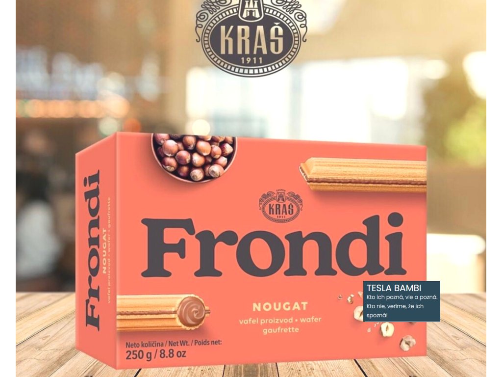 Frondi si svojou dlhoročnou tradíciou získal sympatie všetkých generácií. Vaflové výrobky, v ktorých sa prelína chrumkavosť vaflového plechu a bohatá chuť krému, sú výrobkami, ktoré budú vždy ponúkať plný pocit uspokojenia. Táto dokonalá zmes chutí ponúka dvojnásobné potešenie, takže je ideálnym dezertom po obede alebo večeri v spoločnosti vašej rodiny alebo priateľov. V zaujímavom balení malých krabičiek ponúkame príchute nugátu a kakaa