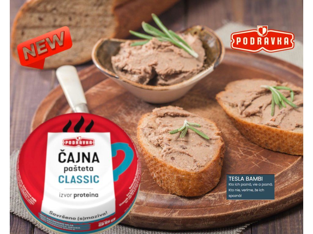 Originálna receptúra paštéty "Čajna" od Podravka pozostáva zo starostlivo vybranej zmesi bravčového a hovädzieho mäsa s pridaním vybraných korenín prispôsobených chuti skutočných gurmánov.